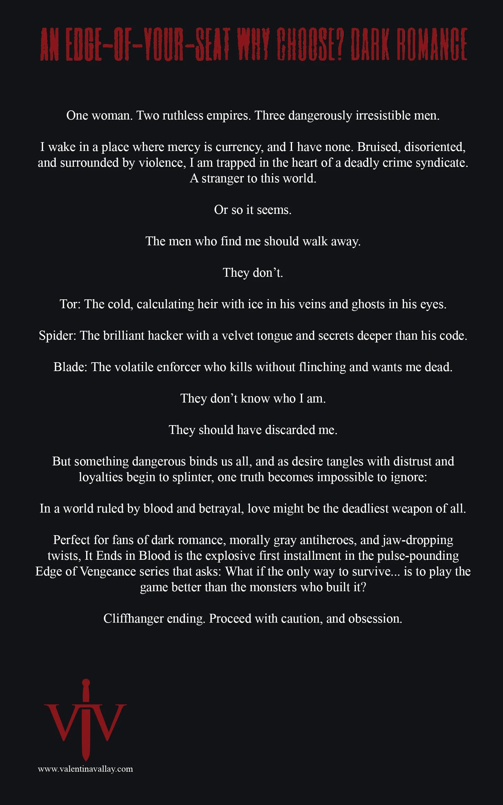 Perfect for fans of dark romance, morally gray antiheroes, and jaw-dropping twists, It Ends in Blood is the explosive first installment in the pulse-pounding Edge of Vengeance series that asks: What if the only way to survive... is to play the game better than the monsters who built it?